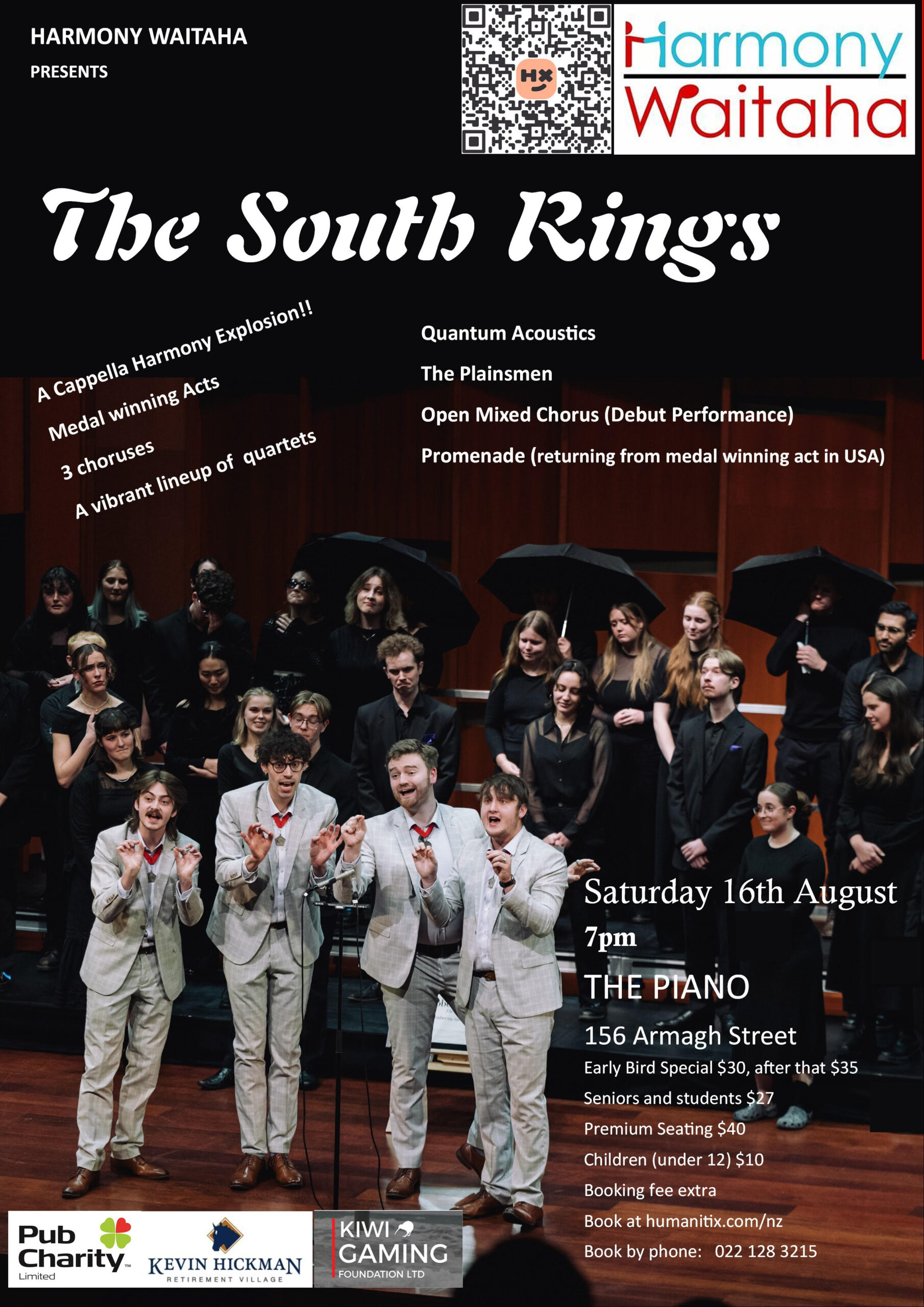 Harmony Waitaha presents “The South Rings” Posted on July 31, 2025 by musiccant3009 Harmony Waitaha presents “The South Rings” on Sunday 16th August 2025, 7.00 p.m. at The Piano, 156 Armagh Street, Christchurch For further information poster below.
